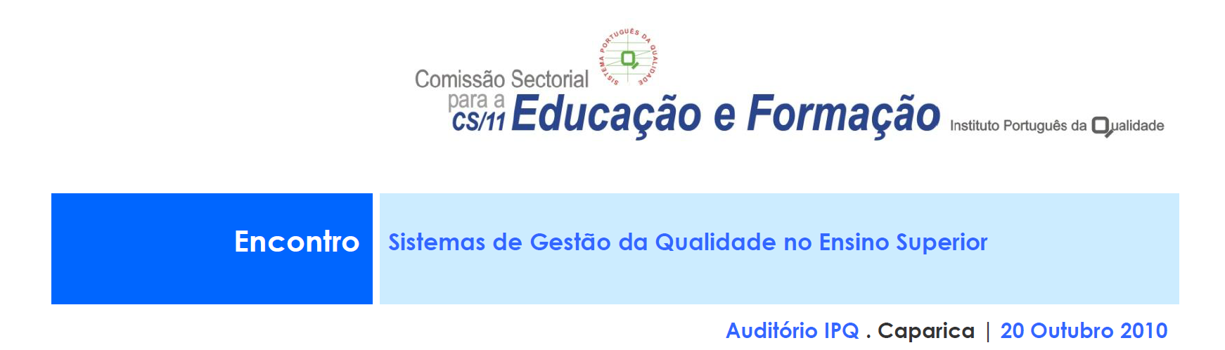 A Comissão Setorial para a Educação e Formação (CS/11) – promovida e dinamizada pelo Instituto Português da Qualidade - IPQ realizou a sua Conferência Anual sobre o tema “Participação dos Estudantes na Governação e na Avaliação da Qualidade nas Instituições de Educação e Formação”, no Auditório do IAPMEI – Edifício L Campus do Lumiar.